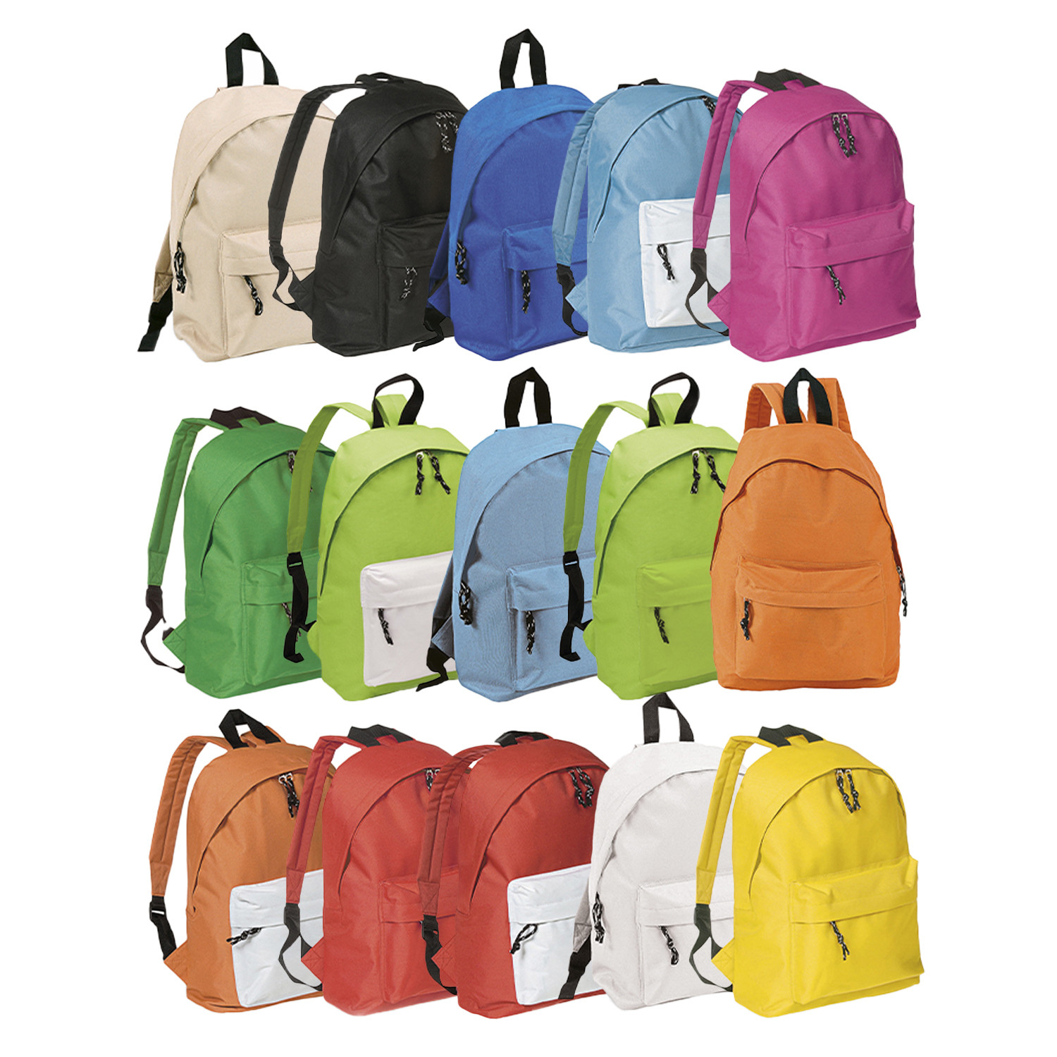 Two main compartments with zipper closure and front pocket.